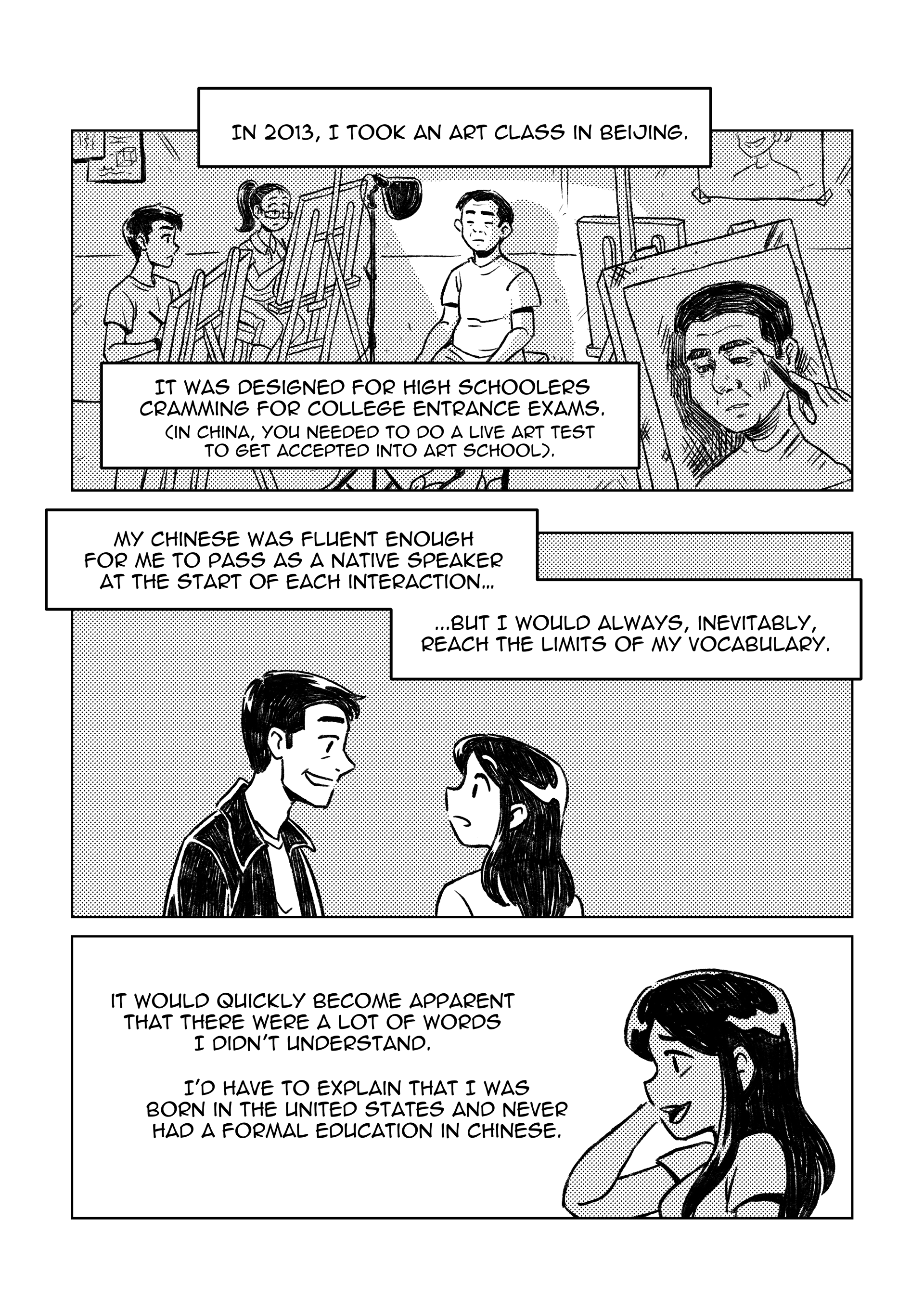 Banana in Beijing is an autobiographical comic about growing up as a Chinese-American, facing internalized racism, and the common dilemma of feeling simultaneously too Chinese and too American at the same time.